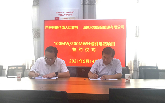 水發(fā)綜能公司與巨野縣田橋鎮(zhèn)人民政府簽約100MW/200MWH儲能電站項(xiàng)目