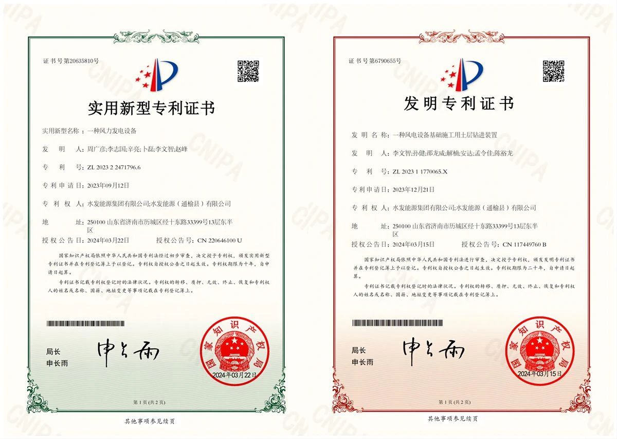 喜報!水發(fā)能源通榆公司實用新型專利加一、發(fā)明專利再加一