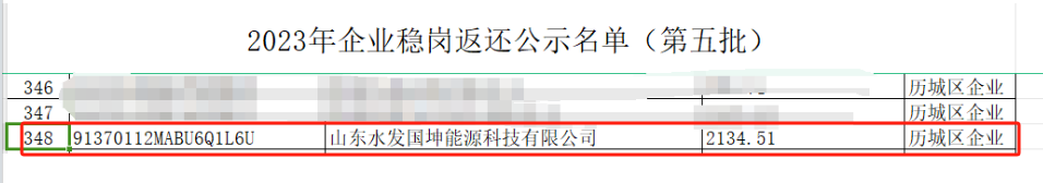 水發國坤公司入選濟南市歷城區“2023年企業穩崗返還公示名單”