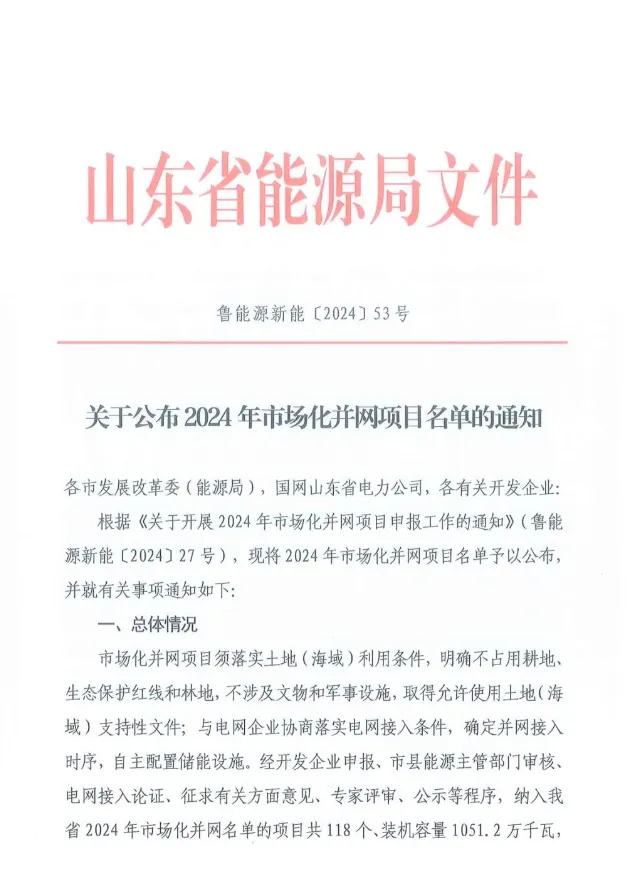 能源資訊丨光伏項目10.46GW!山東2024年市場化并網項目名單公布(附完整名單)